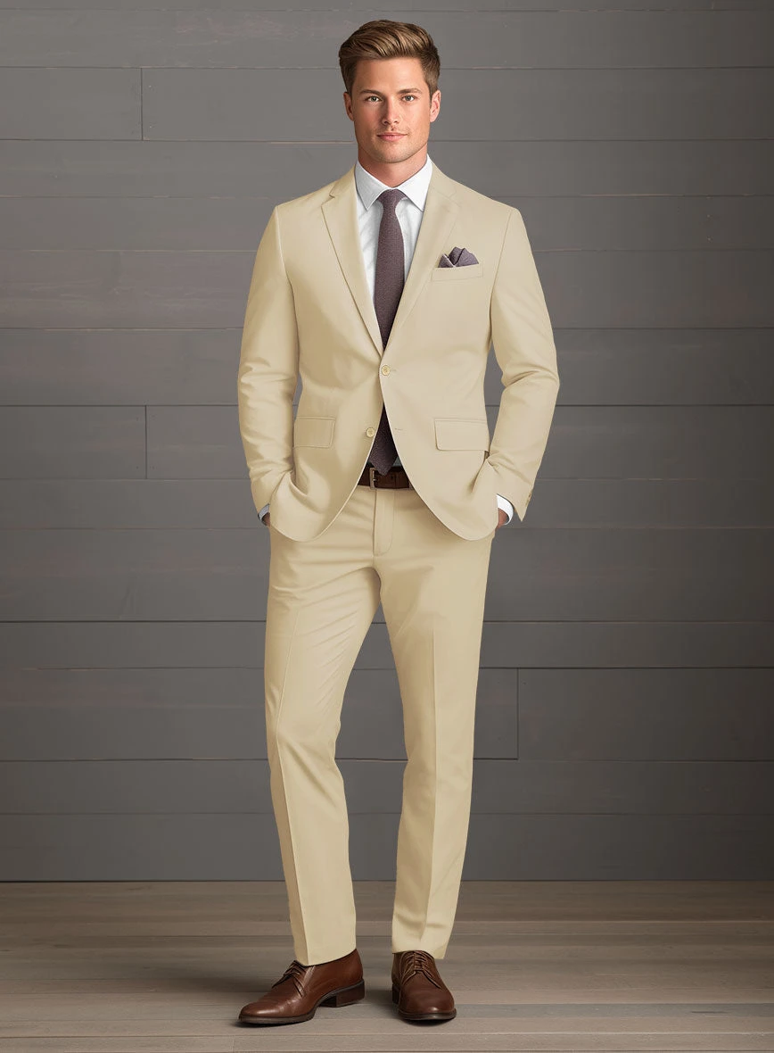 The ultimate comfortable outfit choice a man could ever have is our stretch suit which also keeps your sense of style in the forefront at your next evening do. Crafted from cotton lycra blend, the Beige Feather Cotton Canvas Stretch Suit preserves its allure unaltered so as one can exude stylish statement.