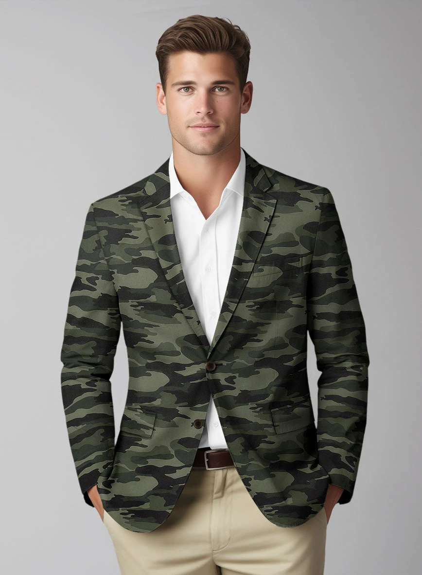 This versatile blazer features a trendy camouflage pattern, adding urban appeal to any outfit