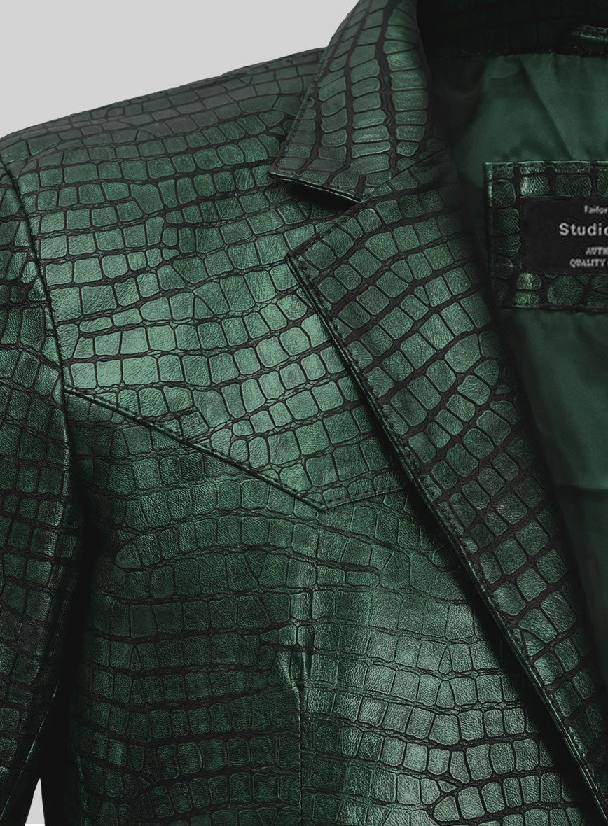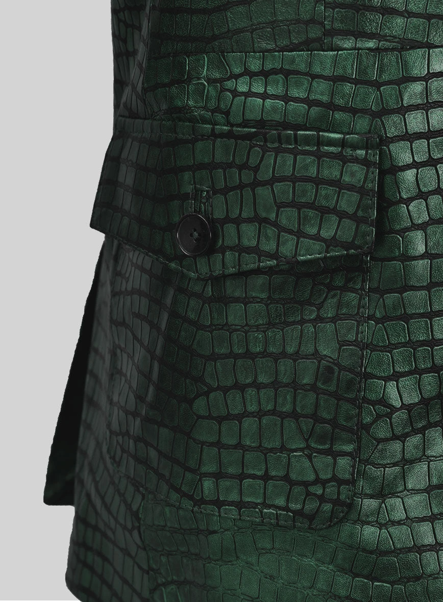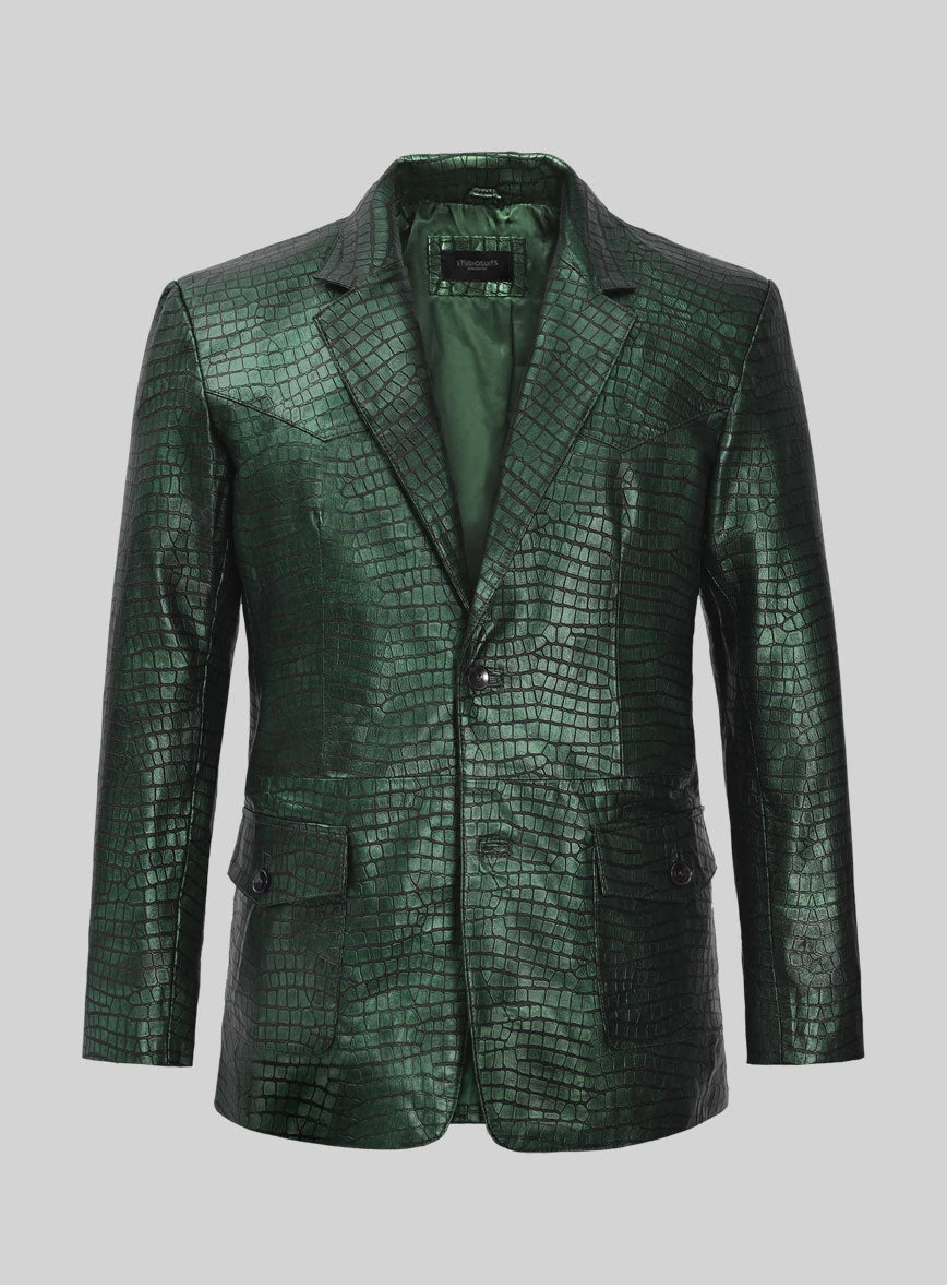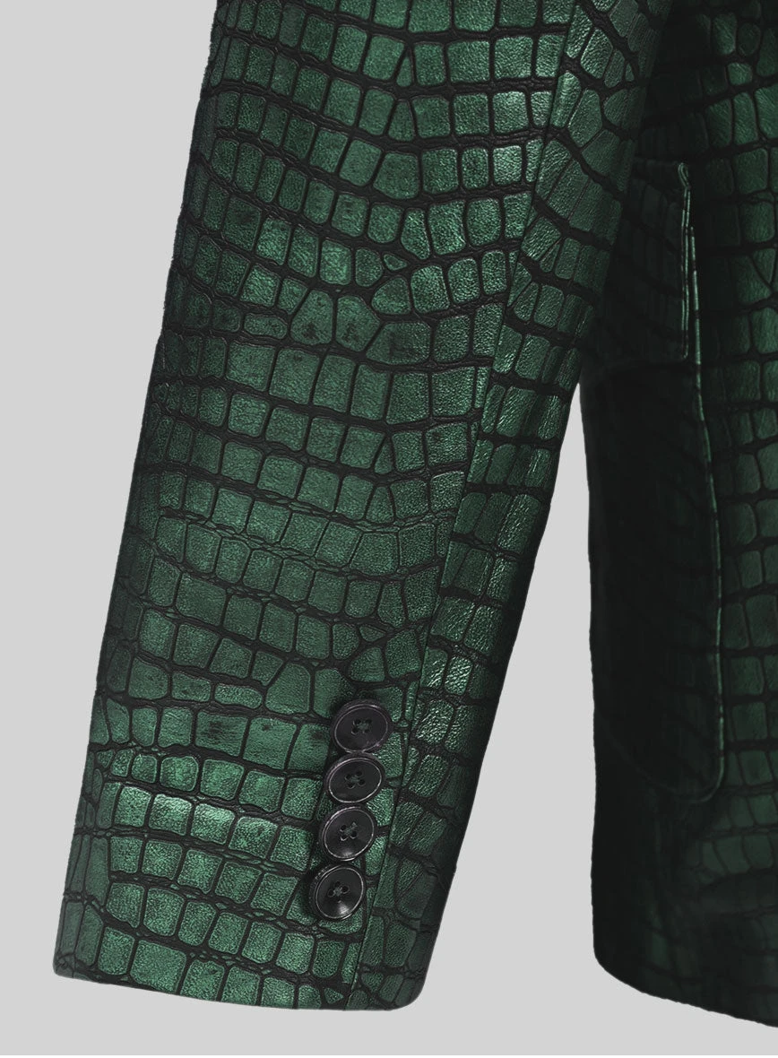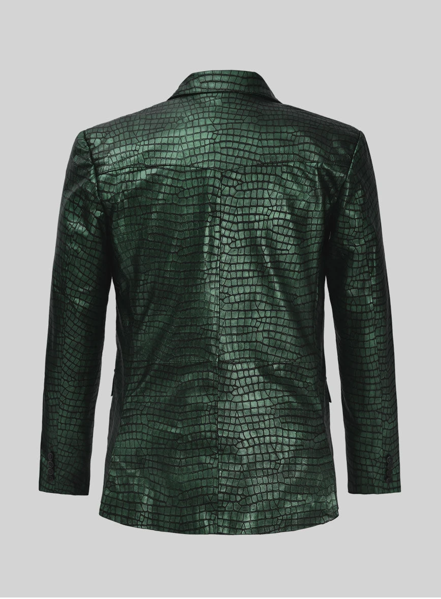 Enable your fashion status and stand out as a true trendsetter with our Croc Metallic Green Western Leather Blazer. This exquisite piece exudes elegance and style, ensuring you become the most charming presence in any room. Craft a truly remarkable ensemble with our leather blazer, destined to become a standout couture piece in your wardrobe.