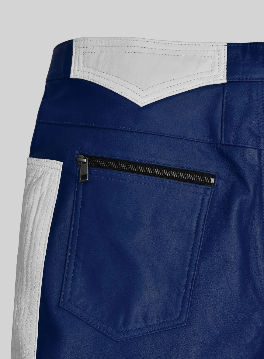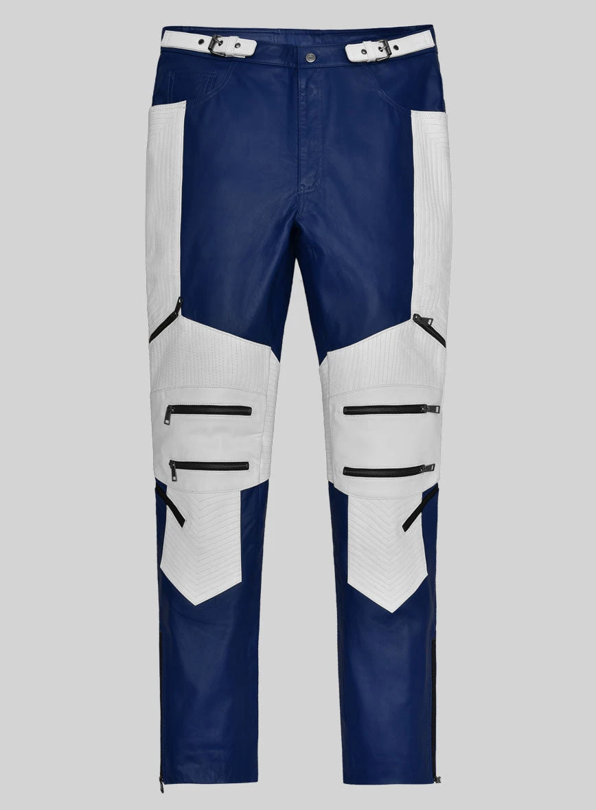 Indulge in a sleek and cool aesthetic with our unparalleled leather pants. Made from luxurious PURE Napa leather, these electric zipper pants feature a striking two-tone blue and white pattern for a truly standout look.