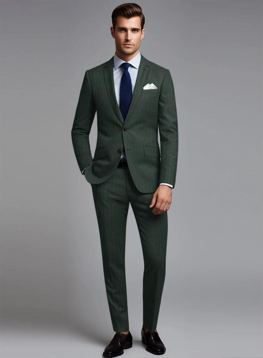 Looking to add a touch of vibrancy to an otherwise lackluster day? Introducing our Green Herringbone Wool Suit that offers a splendid avenue. Handcrafted from a wool blend fabric, this suit is a visual delight. The interlocking herringbone pattern, splashed with a luscious green hue, is like a breath of fresh air, disrupting the monotony of grays and blues. Whether you’re conquering the office or jazzing up your weekend look, this suit is your go-to for both versatility and panache.