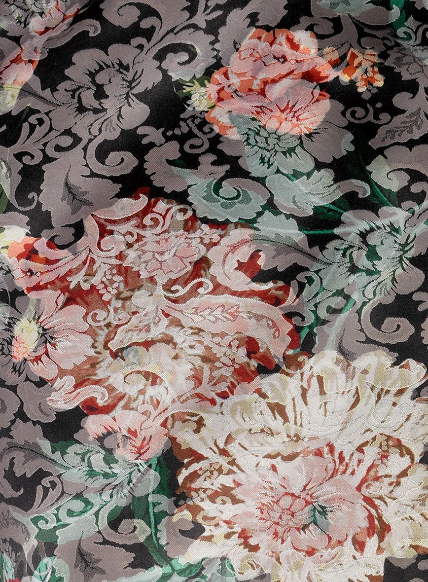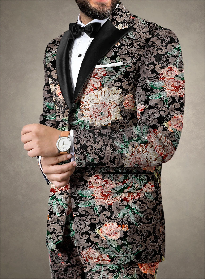 Step into this whimsical realm where the iconic tuxedo transcends into a kaleidoscopic burst of our Italian Cotton Stretch Valeria Tuxedo Blazer— a fusion of audacity and refinement. Meticulously tailored from a cotton blend, it grants the liberty to move gracefully and effortlessly. A vibrant tapestry of multihued florals cascading across black fabric, bringing a garden of boldness to your ensemble. Whether you’re owning the red carpet, black-tie event or redefining the rules at a formal affair, this piece is your accomplice in making a statement that’s uniquely, unmistakably you.