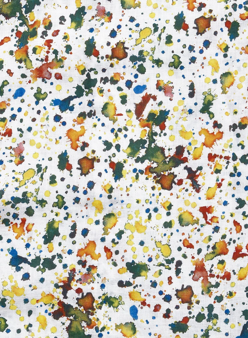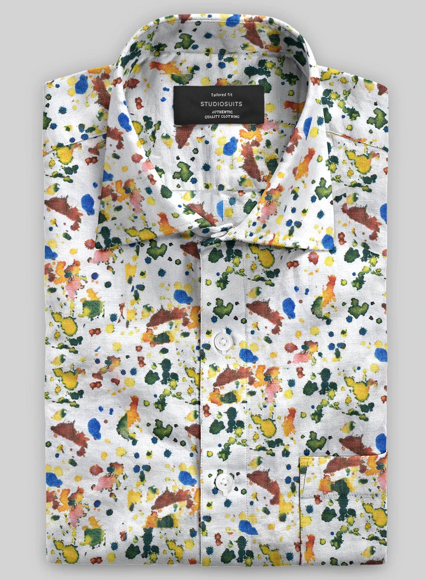 Add a splash of contemporary style and comfort to your button-down ensemble with our Italian Linen Eujeni Shirt. Crafted from pure linen fabric, this shirt not only serves as a good conductor of heat but also boasts high absorbency. The captivating paint splatter pattern adorning the white fabric adds an intriguing burst of colors, exuding a sense of artistic freedom and creativity.