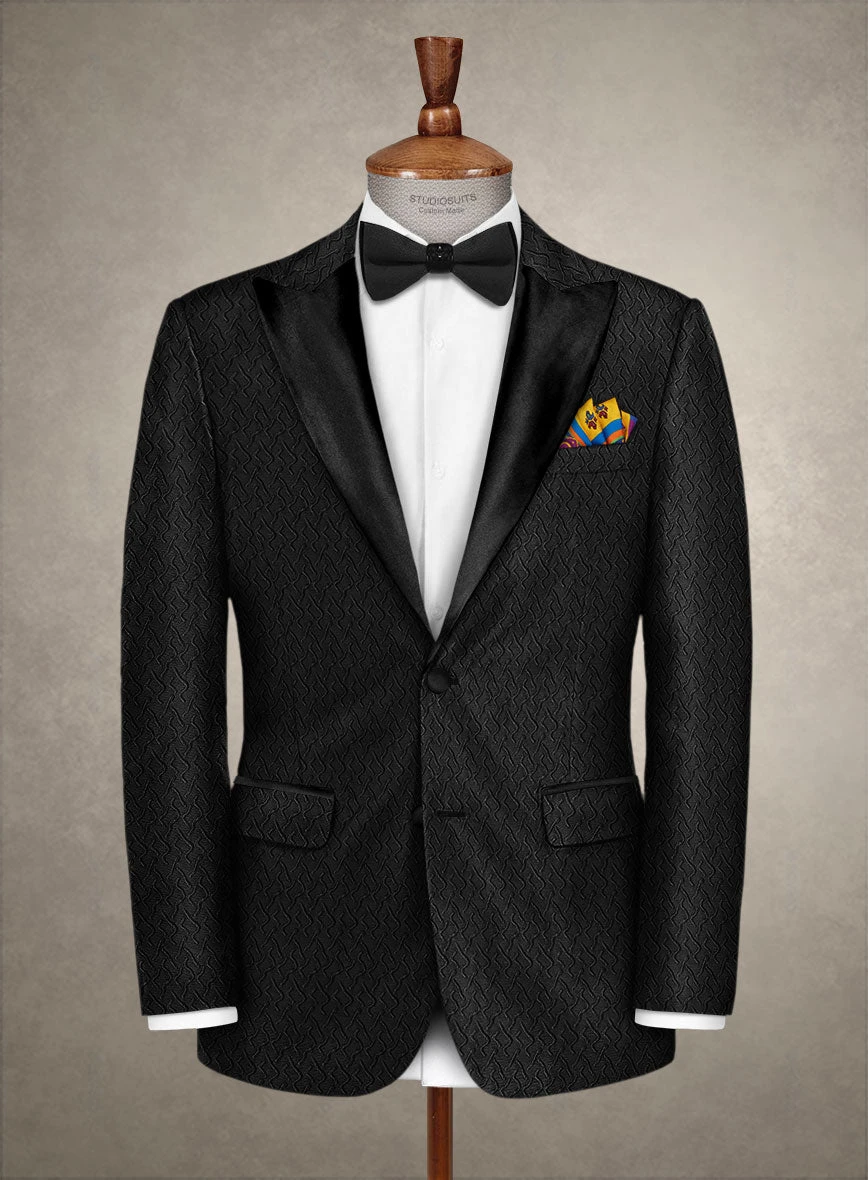 Reinterpret style through a prism of modernity with our Italian Toforo Tuxedo Jacket that establishes a strong perspective looks. Tailored with polyester blended fabric, our tuxedo jacket renders a cool embossed texture with elegant strikes over a black background that gives a shiny appearance. Moreover, our jacket will provide you with a comfortable feel that will keep you movable throughout the entire day. So create a majestic appearance for your grand affair that will give you an unforgettable experience.