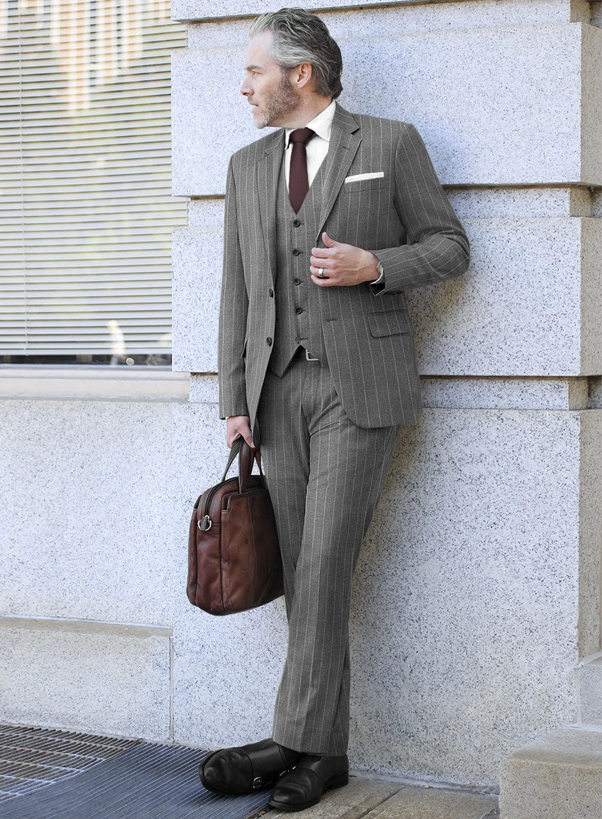 Staying in tune with the season’s prominent trend of blending formal and casual elements, our Italian Uben Gray Chalkstripe Flannel Suit effortlessly delivers a simple and timeless look suitable for both work and various occasions. Tailored from exquisite Super 120’s pure wool fabric, this suit showcases a sophisticated gray hue adorned with stripes that not only enhance your presence but also elevate your confidence. Whether it’s weddings, parties, or your workplace, this suit will inspire you to dress your best on every occasion.