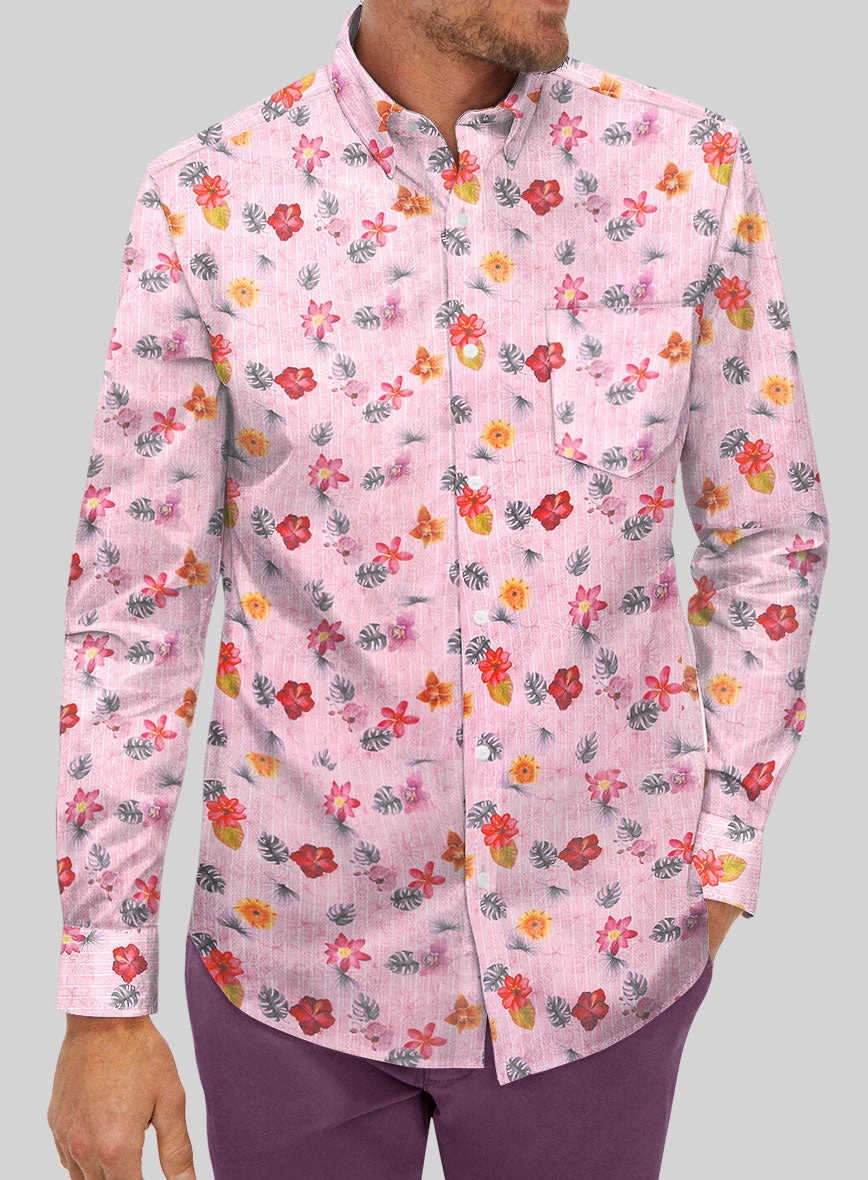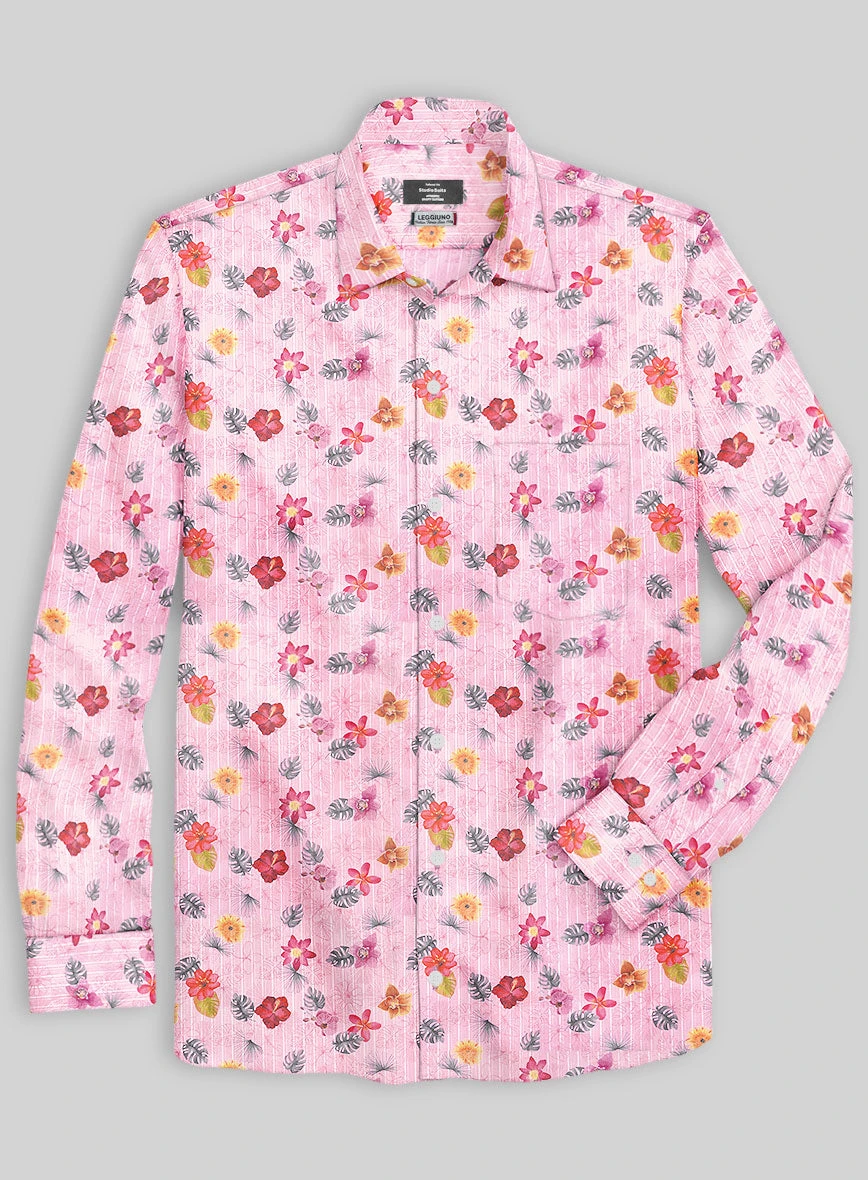 Prepare for a delightful tropical retreat with our Leggiuno Cotton Edga Shirt. Custom-built from airy cotton fabric, it bestows a poised appearance that remains impeccably fresh throughout the day. The vivacious tropical print atop a pink-striped canvas imparts a dash of paradise to your attire.