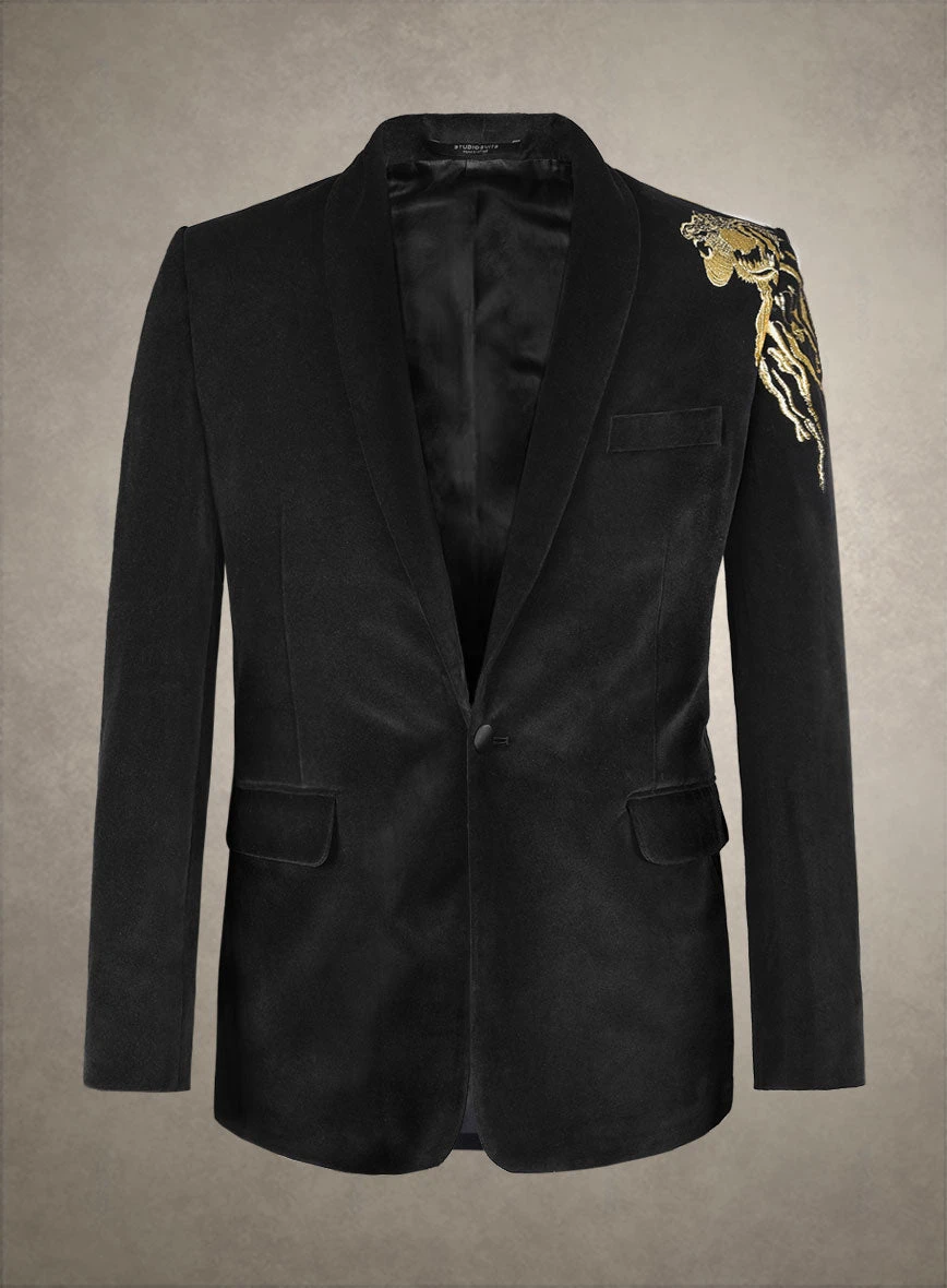 Capture the spirit of confidence and modernize your silhouette while emphasizing style with our Lion Embroidery Velvet Blazer. Boasting a special lion embossed design, this velvet blazer in black shade is made from luxurious cotton that will keep you comfortable while exuding a fashionable feel for any exclusive or affluent occasions. Let this elegant garment be emblematic of your style acumen, infusing your look with refined charm.