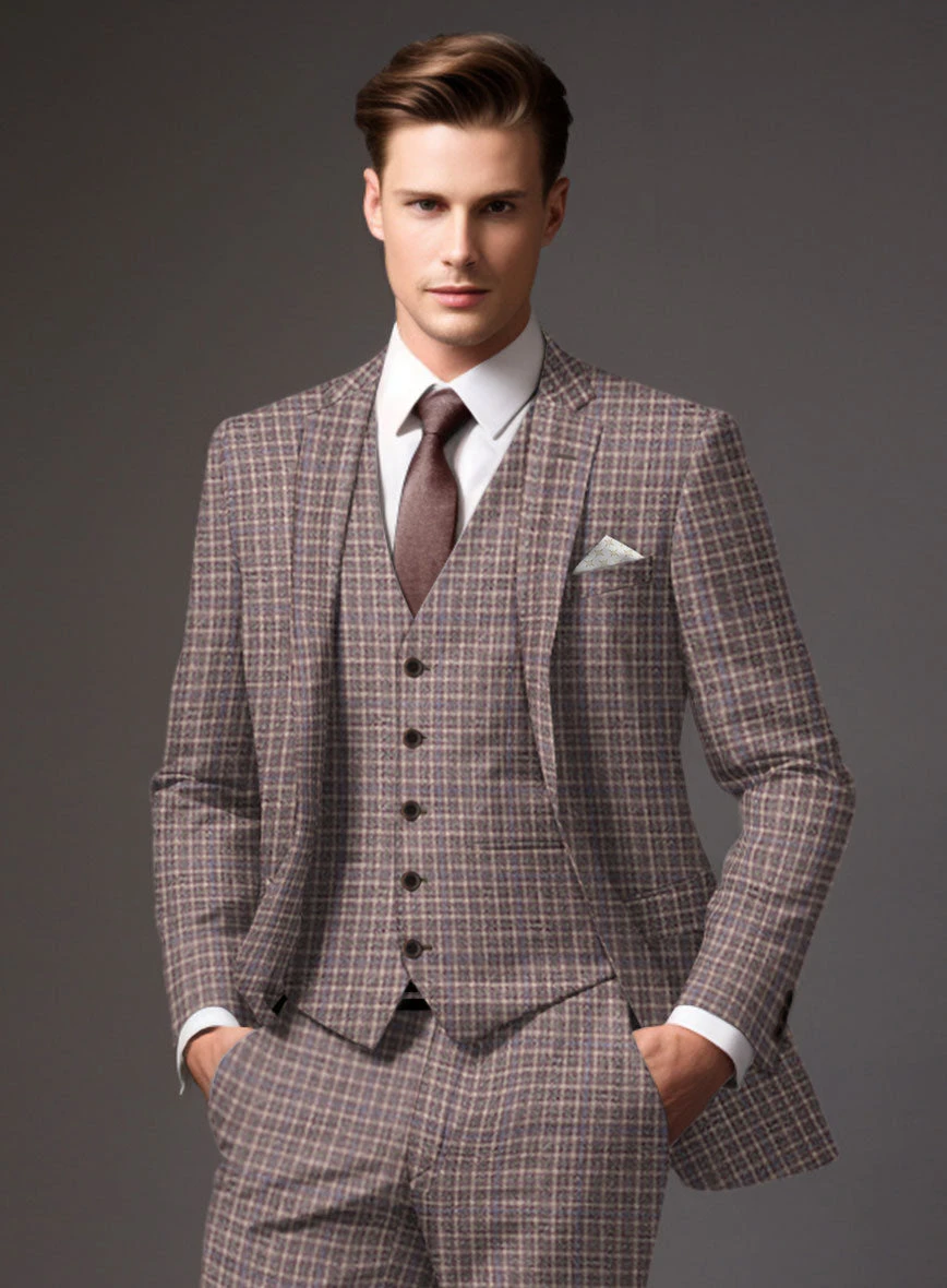 Look features a 2 button jacket with notch lapels, horn brown buttons, single vent, three cuff buttons.
