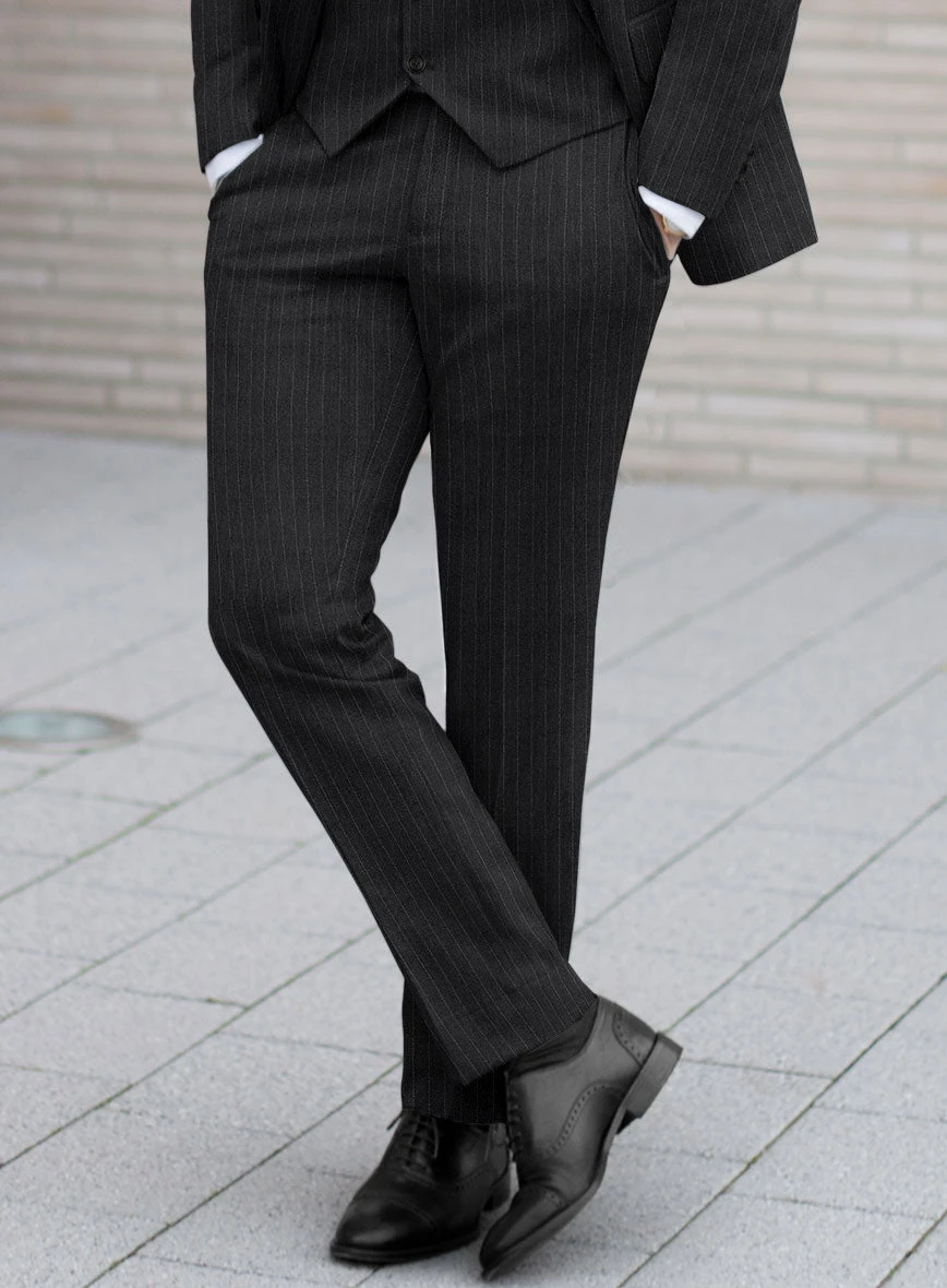 Amplify your overall charm by donning our Scabal Londoner Isai Stripe Charcoal Wool Pants, designed to add an irresistible allure to your look. Expertly crafted from luxurious wool fibers, it envelops you in a dynamic charcoal shade with subtle hints of thin gray vertical stripes, enhancing its overall elegance. Whether you’re crunching numbers in the office, attending weddings, or enjoying a day at the races, it’s a corker.