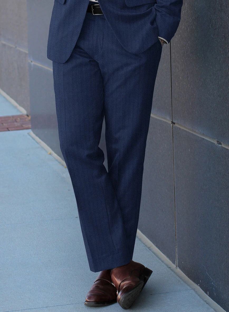 Herringbone, aside from being a delightful word to say, is also the vehicle that transports our Scabal Tornado Herringbone Blue Wool Pants to stylish heights. Constructed from premium wool, its herringbone pattern is typically woven into the blue fabric, resulting in a rich and visually interesting texture. This makes it a versatile choice for various occasions, including work, weddings, and after-hours gatherings.