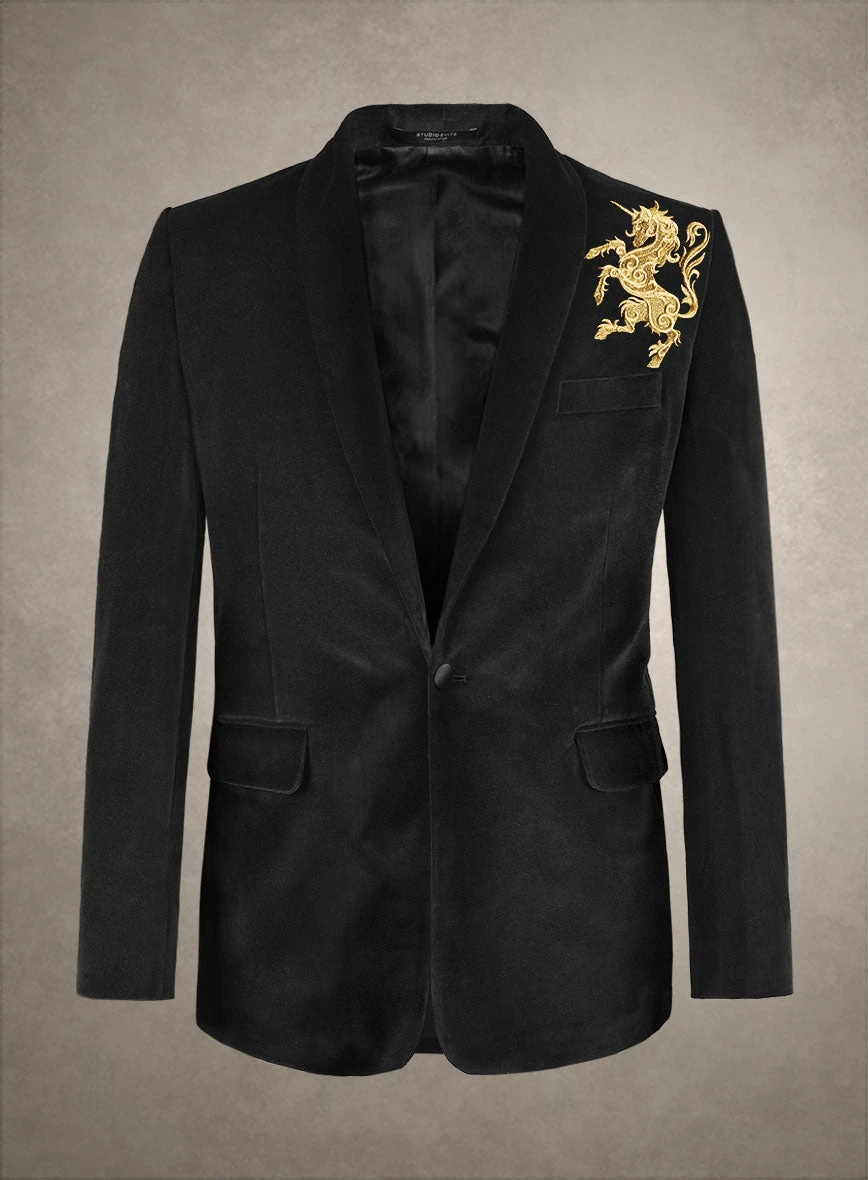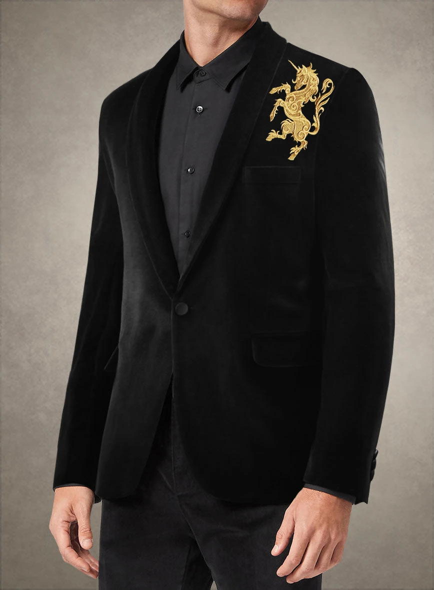 Envision the essence of chic vibes with a hint of enigma in our Unicorn Embroidery Velvet Blazer. Made from lush cotton, its commanding black velvet canvas adorned with golden unicorn embroidery pays homage to the daring and exceptional within you. Whether you’re owning a red carpet, leaving an unforgettable mark at a soiree, or just jazzing up your casual game, this blazer injects your style with a dose of royal charm and a sprinkle of playful magic.